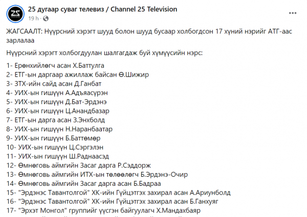 Тэгвэл АТГ-аас өчигдөр нэр бүхий 17 хүнийг нүүрсний хулгайтай холбогдуулан нэрийг нь зарласан. Гэхдээ шүүхийн шийдвэр эцэслэн гараагүй байхад хэнийг ч гэмт хэрэгтэй гэж үзэхгүй, зөвхөн сэжигтэн гэж үзэх үндэслэлтэйг онцолсон.