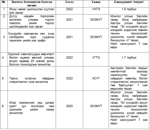 Үүнд цусны үүдэл эс, ясны чөмгийг донороос өвчтөнд шилжүүлэн суулгах эмчилгээ, хүнд хэлбэрийн зүрх судасны гажгийн үеийн мэс засал, зүрхний хавхлагуудын өөрчлөлт болон ишеми өвчний улмаас агших чадвар 25 хувиас доош болсон тохиолдлын эмчилгээ зэргийг УНТЭ-ийн Цусны эмгэг, чөмөг шилжүүлэн суулгах төв, Зүрх судасны төвүүд дээр төвлөрүүлэн хийж эхэлсэн бөгөөд эмч мэргэжилтнүүдийг бодлогоор Франц, БНСУ-д  суралцуулж, АНУ, Япон, БНСУ-ын мэргэжлийн багуудын алсын зайн дэмжлэгтэйгээр хийж эхэлсэн.