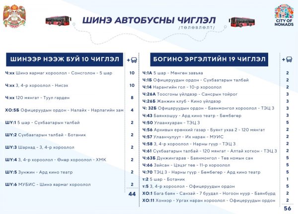 Энэ талаар Нийслэлийн Нийтийн тээврийн газрын Тээвэр төлөвлөлтийн хэлтсийн дарга Б.Тамир “Өнөөдрийн байдлаар шинэ автобуснууд маань “Чингэлтэй-Зүрх уул”, “Хайлааст-МУБИС”, “5 шар-Ботаник” зэрэг чиглэлүүдэд үйлчилгээнд явж эхлээд байна. Бид үйлчилгээний хүртээмжийг нэмэх, шинэ суурьшлын бүсэд нийтийн тээврийн үйлчилгээг хүргэх зорилгоор 10 чиглэлд 44 автобус нэмж, богино эргэлтийн 19 чиглэлд 56 автобусыг хөдөлгөөнд оролцуулахаар төлөвлөсөн. “Шинэ Яармаг” хороолол, Нисэхийн эцэс зэрэг шинээр бий болсон суурьшлын бүс болон “Туул гарден”, “Хан Хиллс” зэрэг хотхон руу нийтийн тээврийн үйлчилгээг хүргэх зорилгоор төлөвлөлт гаргасан. Богино эргэлтийн хувьд “Тоосгоны үйлдвэр-Ботаник-Жанжин клуб” гэх алсын чиглэлийг “Тоосгоны үйлдвэр-Сансарын тойрог”, “Жанжин клуб-Кино үйлдвэр” гэх мэтчилэн хоёр хэсэг болгон хуваасан. Ингэснээр тухайн чиглэлүүд дэх эргэлтийн хурд нэмэгдэж, зорчигчийн хүлээгдлийн хугацаа буурах юм.