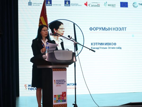 “Жендэрийн мэдрэмжтэй төсөвлөлт” үндэсний форумыг нээж Удирдлагын академийн захирал Д.Сүрэнчимэг, Сангийн дэд сайд C.Мөнгөнчимэг, Канад улсын элчин сайд Кэтрин Ивкоф, MERIT төслийн Монгол дахь суурин төлөөлөгч Женнифер Адамс нар үг хэллээ.