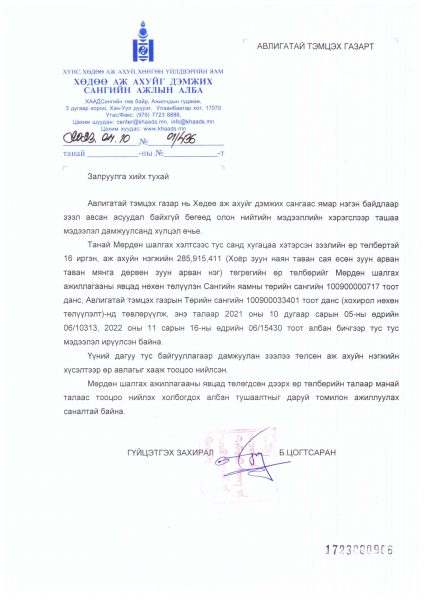 Авлигатай тэмцэх газар нь Хөдөө аж ахуйг дэмжих сангаас 285 сая төгрөгийн зээл авсан гэх мэдээлэл олон нийтэд мэдээлэгдсэнтэй холбогдуулан Хөдөө аж ахуйг дэмжих сангийн ажлын албанаас дараах албан бичгийг 2023 оны 4 дүгээр сарын 10-ны өдөр АТГ-т ирүүлжээ.