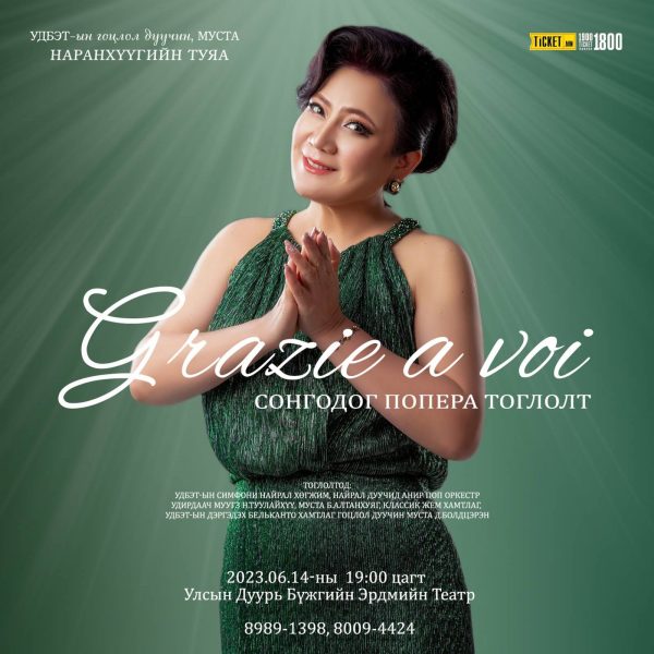 Улсын Дуурь бүжгийн эрдмийн театрын гоцлол дуучин, Соёлын тэргүүний ажилтан Наранхүүгийн Туяа энэ сарын 14-нд “GRAZIE A VOI” бие даасан сонгодог попера тоглолтоо хийх гэж байна.