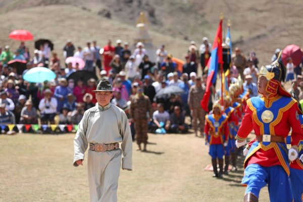 Дараа нь хүндэт харуулын цэргүүд Монгол Улсын Төрийн далбаа, Бүх цэргийн Их хар сүлдний Умарын элч сүлд, Өмнөговь аймгийн далбаа, Их эзэн Чингис хааны хөрөг, Төрийн долоон эрдэнийг тахилын ширээнээ залж байрлуулав.