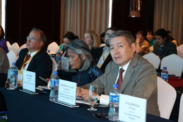 “Орчны эрүүл мэнд” Олон улсын эрдэм шинжилгээний хурлын нээлтэд Эрүүл мэндийн дэд сайд С.Энхболд, Анагаахын Шинжлэх Ухааны Үндэсний Их Сургуулийн захирал Н.Хүрэлбаатар, Дэлхийн Эрүүл мэндийн байгууллагын Монгол дахь суурин төлөөлөгч Сокорро Эскаланте, Техасын Их Сургуулийн Анагаах Ухааны сургуулийн профессор Грегори Грей нар оролцож үг хэллээ.