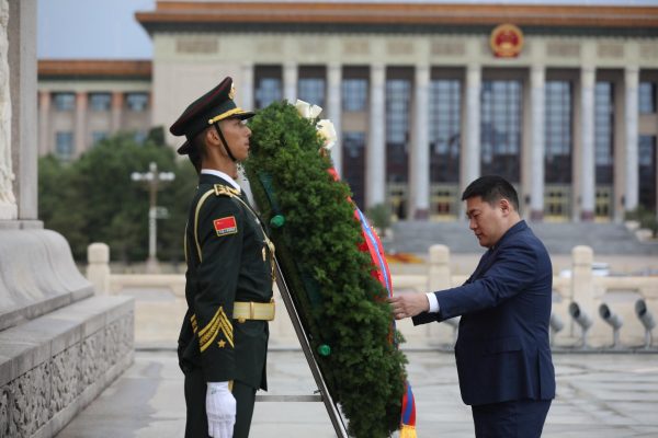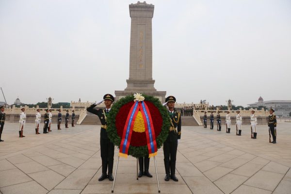 БНХАУ-д албан ёсны айлчлал хийж буй Монгол Улсын Ерөнхий сайд Л.Оюун-Эрдэнэ 2023 оны зургадугаар сарын 28-ны өдөр Бээжин хотноо Хятадын Ардын баатруудын хөшөөнд цэцэг өргөв.
