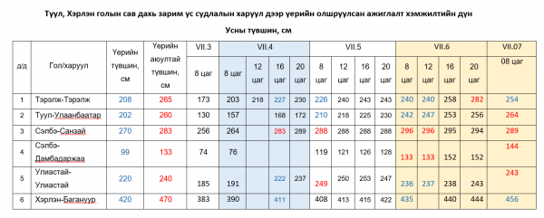 Тэрэлж орчмоор усны түвшин өмнөх 20 цагаас хойш 28 см буурч, үерийн түвшинг 45 см давлаа. Туул гол өмнөх өдрийн 20 цагаас хойш 8 см нэмэгдэж, үерийн аюултай түвшинг 5 см даван хүчтэй үерлэж байна. Туул гол Улаанбаатар хот орчимд усны түвшин дахин нэмэгдэж, 270 см болох магадлалтай байгаа юм.