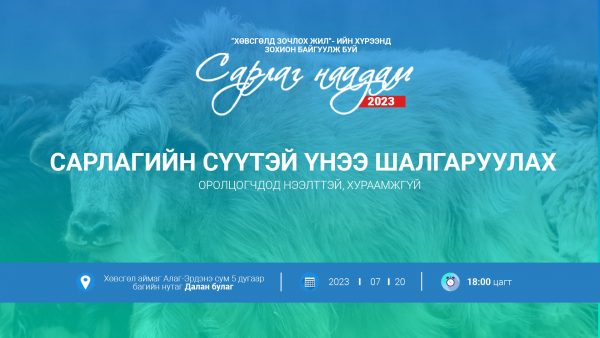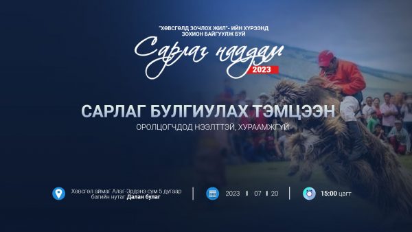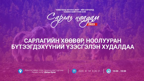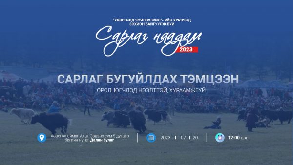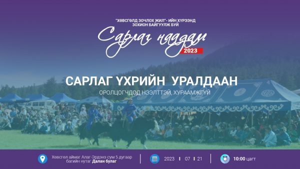 Сарлагийн хөөвөр, ноолууран бүтээгдэхүүний үзэсгэлэн худалдаа зохион байгуулагдана. Мөн  “САРЛАГ НААДАМ”-2023  арга хэмжээний тэмцээн, уралдаанд оролцогчдоос хураамж авахгүй.