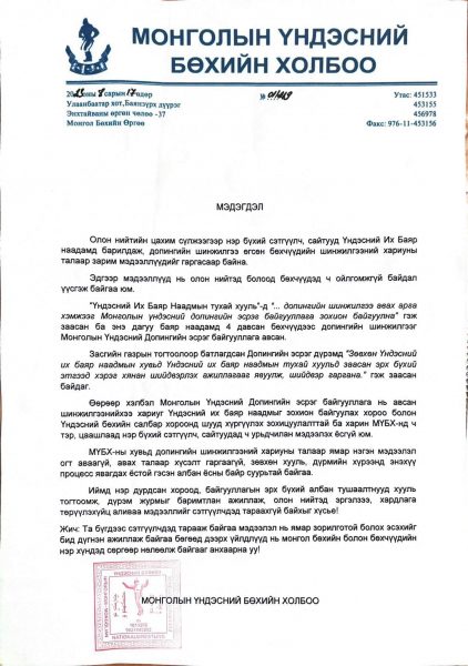МҮБХ допингийн шинжилгээний хариуны талаар ямар нэгэн мэдээлэл огт аваагүй, авах талаар хүсэлт гаргаагүй, зөвхөн хууль, дүрмийн хүрээнд энэхүү процесс явагдах ёстой гэсэн албан ёсны байр суурьтай байгаа.