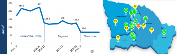 Хагас кокс буюу боловсруулсан бүтээгдэхүүн ашигласнаар тоосонцор нь 124мкг/м3-ээс 67.5мкг/м3буюу 45.5%-иар буурна. Энэ нь “Агаарын чанар. Техникийн ерөнхий шаардлага” MNS 4585:2007 стандартын дагуу тоосонцор болон хүхэрлэг хийн хэмжээ “51-100 хэвийн” түвшинд хүрэхээр байна.