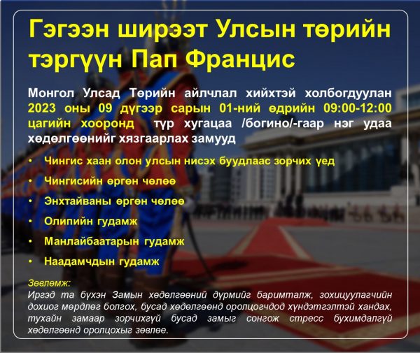 Гэгээн Ширээт Улсын төрийн тэргүүн Пап Францис Монгол Улсад Төрийн айлчлал хийхтэй холбогдуулан өнөөдөр буюу есдүгээр сарын 1-ний 09:00-12:00 цагийн хооронд түр хугацаагаар нэг удаа дараах замын хөдөлгөөнийг хязгаарлана.