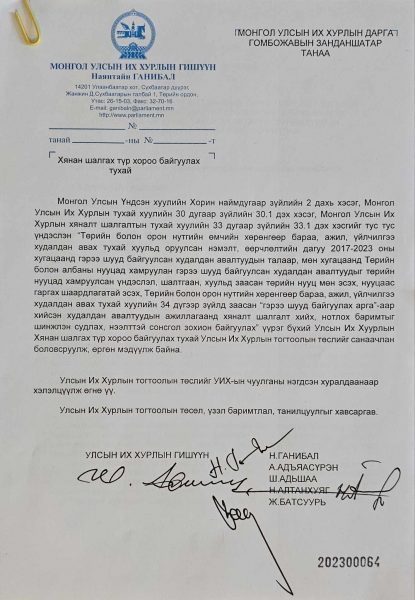 Уг Хянан шалгах түр хороо байгуулах тухай тогтоолын төслийг нийт 19 гишүүн дэмжиж гарын үсэг зурсан тохиолдолд тогтоолын төслийг УИХ-ын даргад өргөн барих юм.
