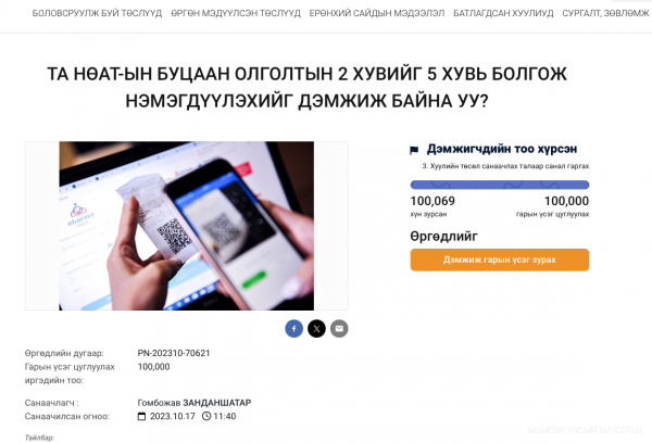Дээрх саналыг petition.parliament.mn цахим системд 2023.10.17-ны 11 цаг 40 минутад байршуулснаас хойш зургаа хоногийн хугацаанд дэмжсэн иргэдийн тоо 100 мянгад хүрлээ.