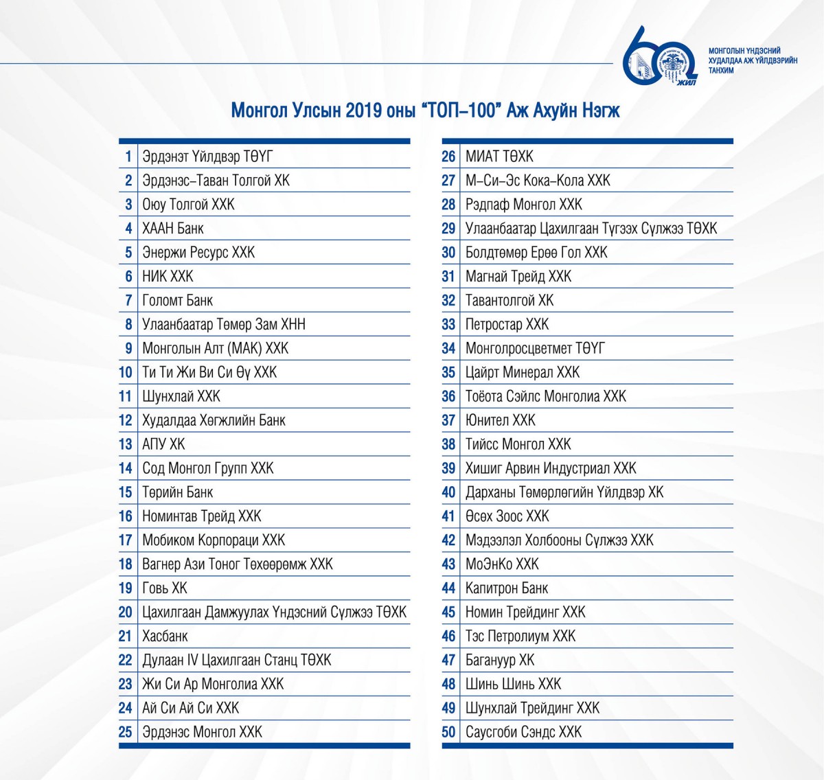 2019 оны ТОП 100 ААН-ийн борлуулалтын орлого 34.3 их наяд төгрөг бөгөөд энэ нь ДНБ-ий 93 хувь, төлсөн татварын хэмжээ нь 6.3 их наяд төгрөгт хүрч татварын нийт орлогын 65 хувийг бүрдүүлж байна.