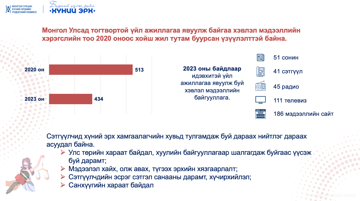 Монгол Улс дахь Хүний эрх, эрх чөлөөний байдлын талаарх 24 дэх илтгэлийн II бүлгийн /2.3. ХҮНИЙ ЭРХ ХАМГААЛАГЧ СЭТГҮҮЛЧИЙН ЭРХИЙН ХЭРЭГЖИЛТ/ сэдвийн 2.3.2-д Сэтгүүлчийн хүний эрх хамгаалах үйл ажиллагааны хэрэгжилт, тулгамдаж буй асуудлыг хөнджээ.
