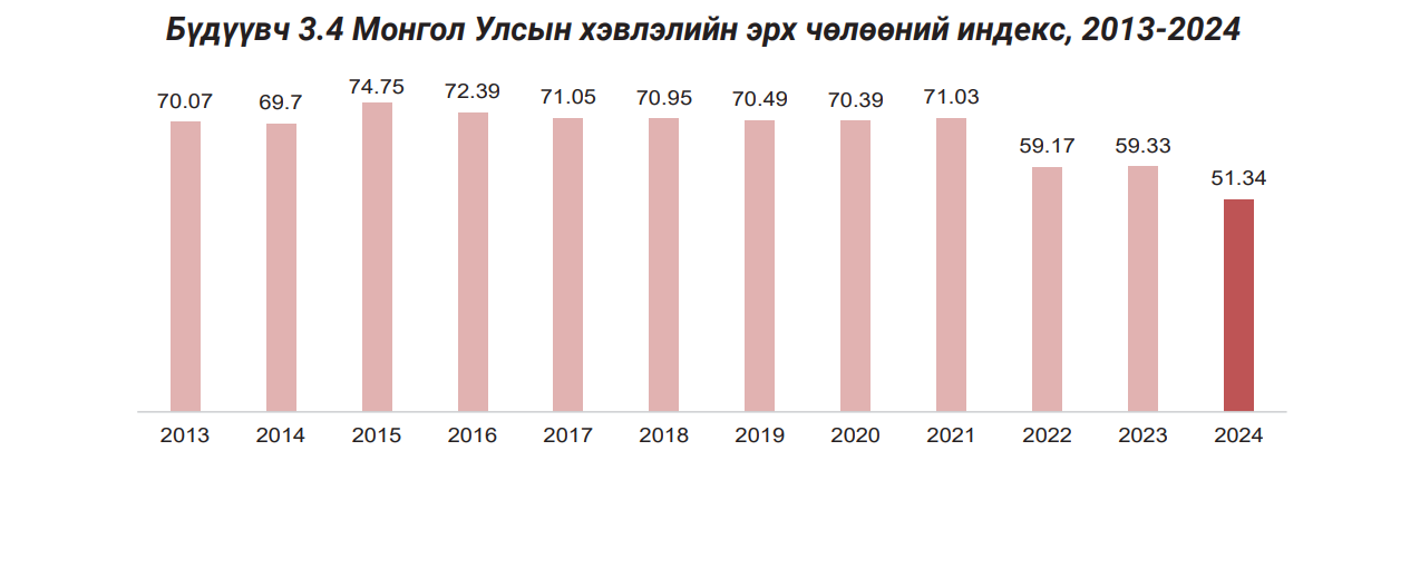 Хэвлэлийн эрх чөлөөний байдал Монгол Улсад хангалтгүйг олон улсын байгууллагууд анхааруулж байна. Тухайлбал “Хил хязгааргүй сэтгүүлчид” олон улсын байгууллагаас жил бүр гаргадаг “Дэлхийн хэвлэлийн эрх чөлөөний индекс”-ийн 2023 оны тайланд Монгол Улсын хэвлэлийн эрх чөлөө 70-аас бага оноотой буюу “асуудалтай” гэж дүгнэсэн бол 2024 онд Монгол Улсын хэвлэл мэдээллийн эрх чөлөөг 51.34 оноотойгоор “муу” гэж дүгнэгдсэн бөгөөд 180 орноос 109 дүгээрт эрэмбэлэгджээ. Энэ нь 2023 оны үзүүлэлтээс 21 байр ухарсан үзүүлэлт бөгөөд хэвлэлийн эрх чөлөө улам бүр хумигдаж байгаа улс орнуудын тоонд багтсан гэсэн үг юм.