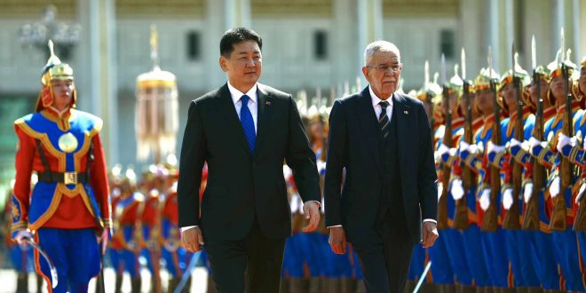 Монгол Улсын Ерөнхийлөгч Ухнаагийн Хүрэлсүх, гэргий Лувсандоржийн Болорцэцэгийн хамт Бүгд Найрамдах Австри Улсын Ерөнхийлөгч Александр Ван дер Беллен, гэргий Дорис Шмидауэр нарыг Д.Сүхбаатарын талбайд угтаж авлаа.