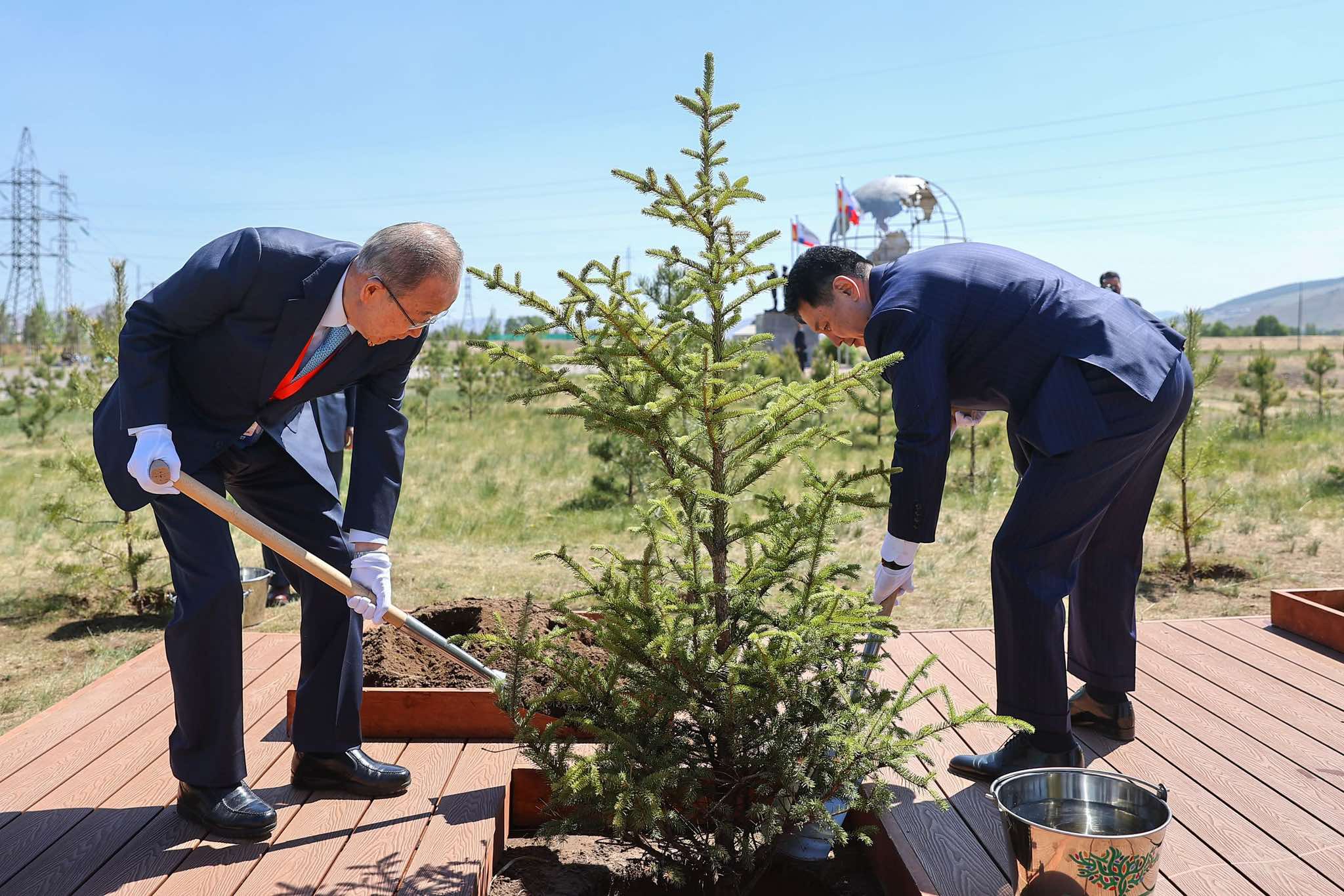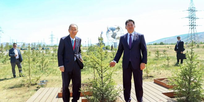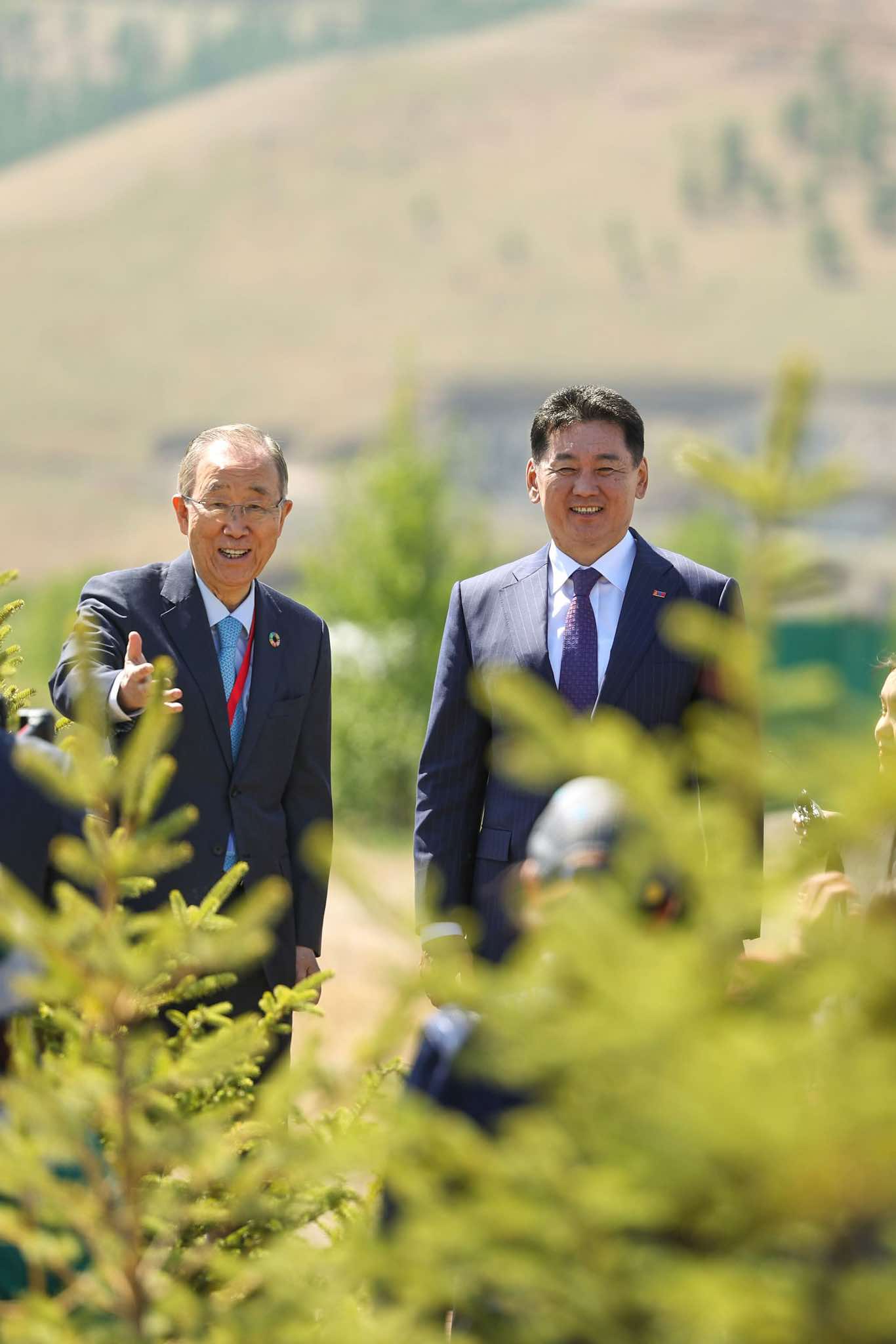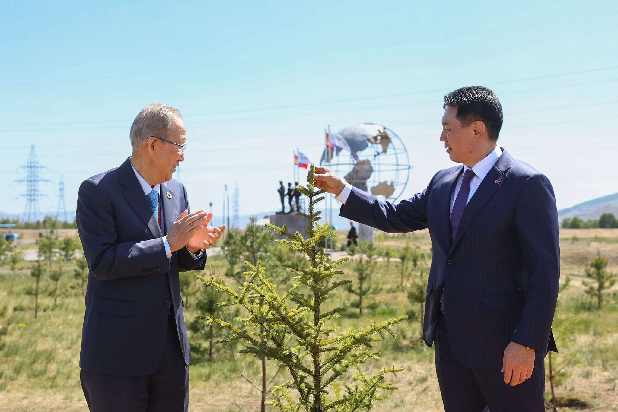 Монгол Улсын Ерөнхийлөгч Ухнаагийн Хүрэлсүх, НҮБ-ын найм дахь Ерөнхий нарийн бичгийн дарга Бан Ги Мүн нар “Тэрбум мод” үндэсний хөдөлгөөний хүрээнд өнөөдөр Үндэсний цэцэрлэгт хүрээлэнгийн Энхийг сахиулагчдын төгөлд дурсгалын мод тарилаа.