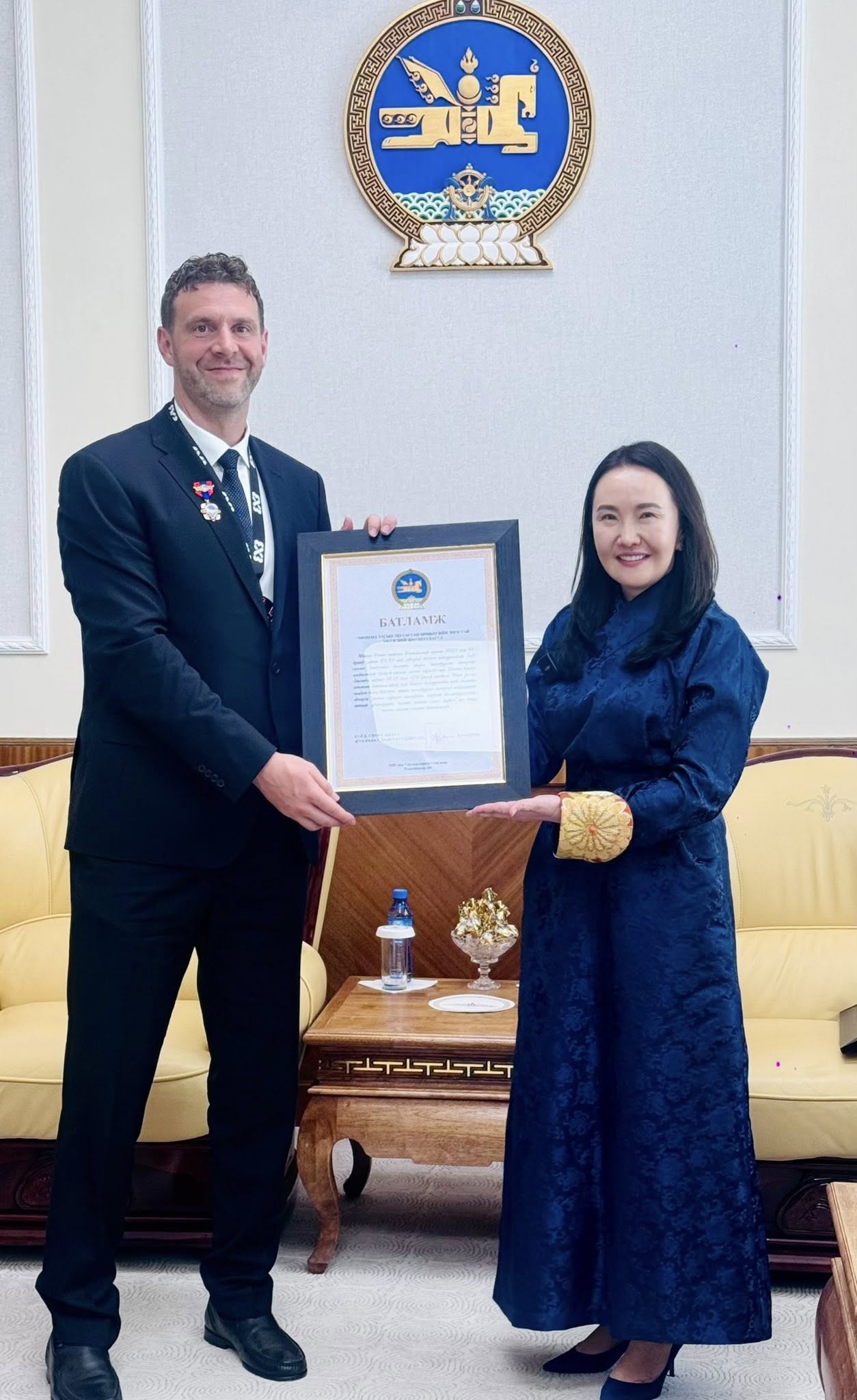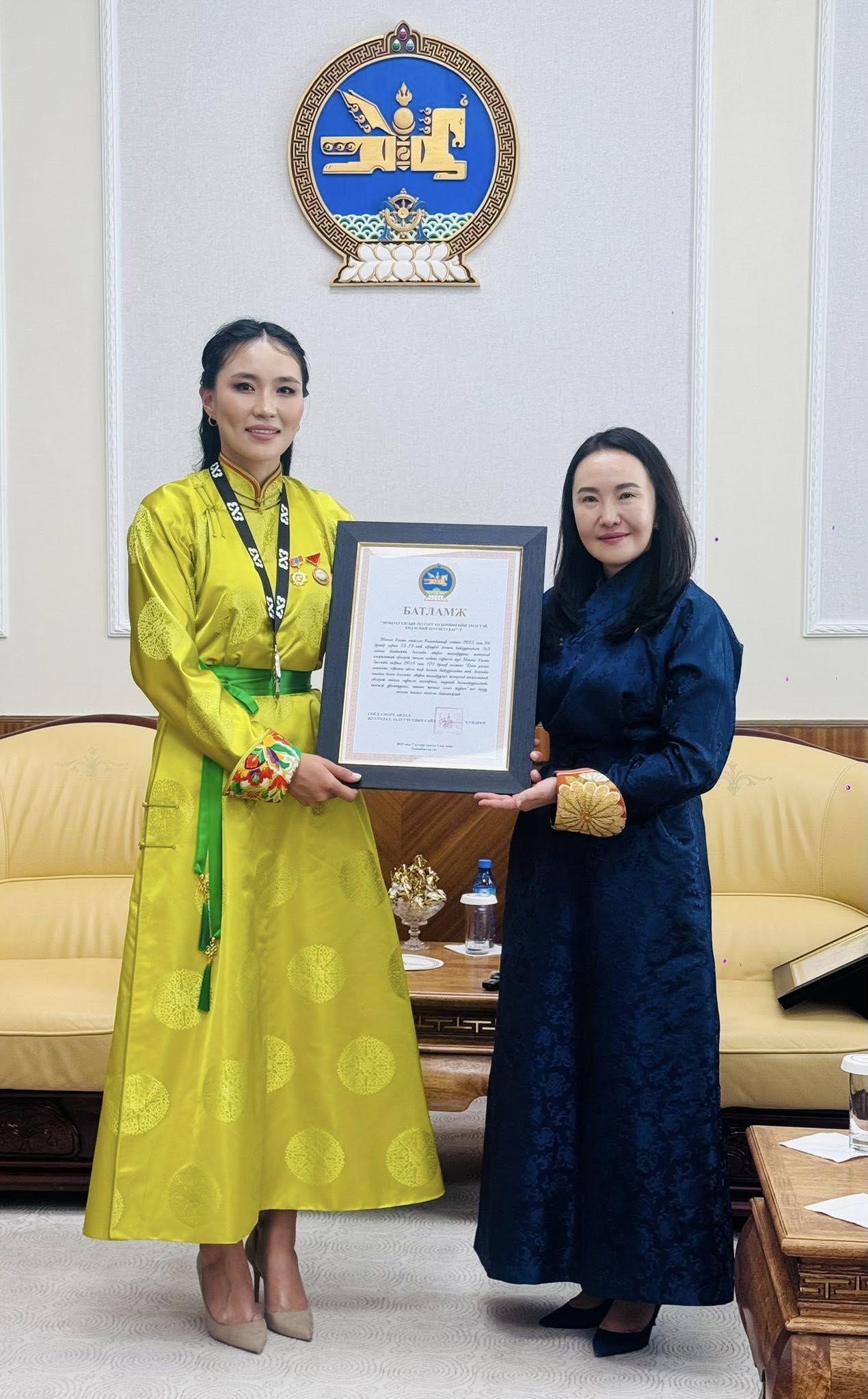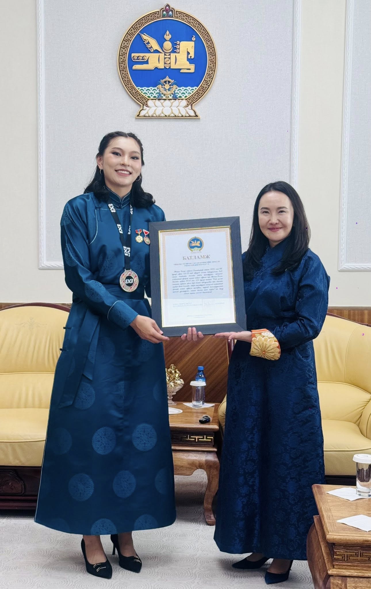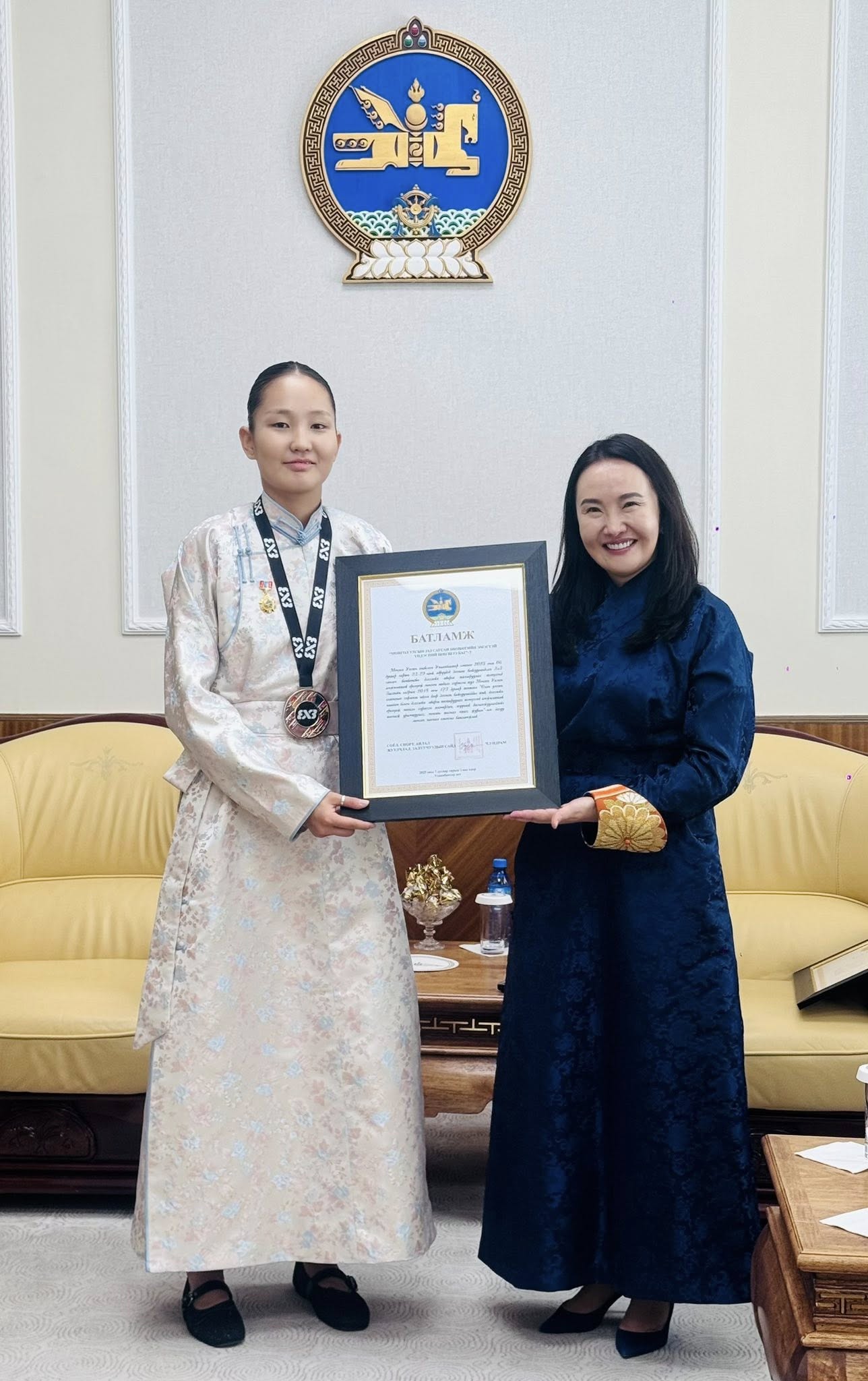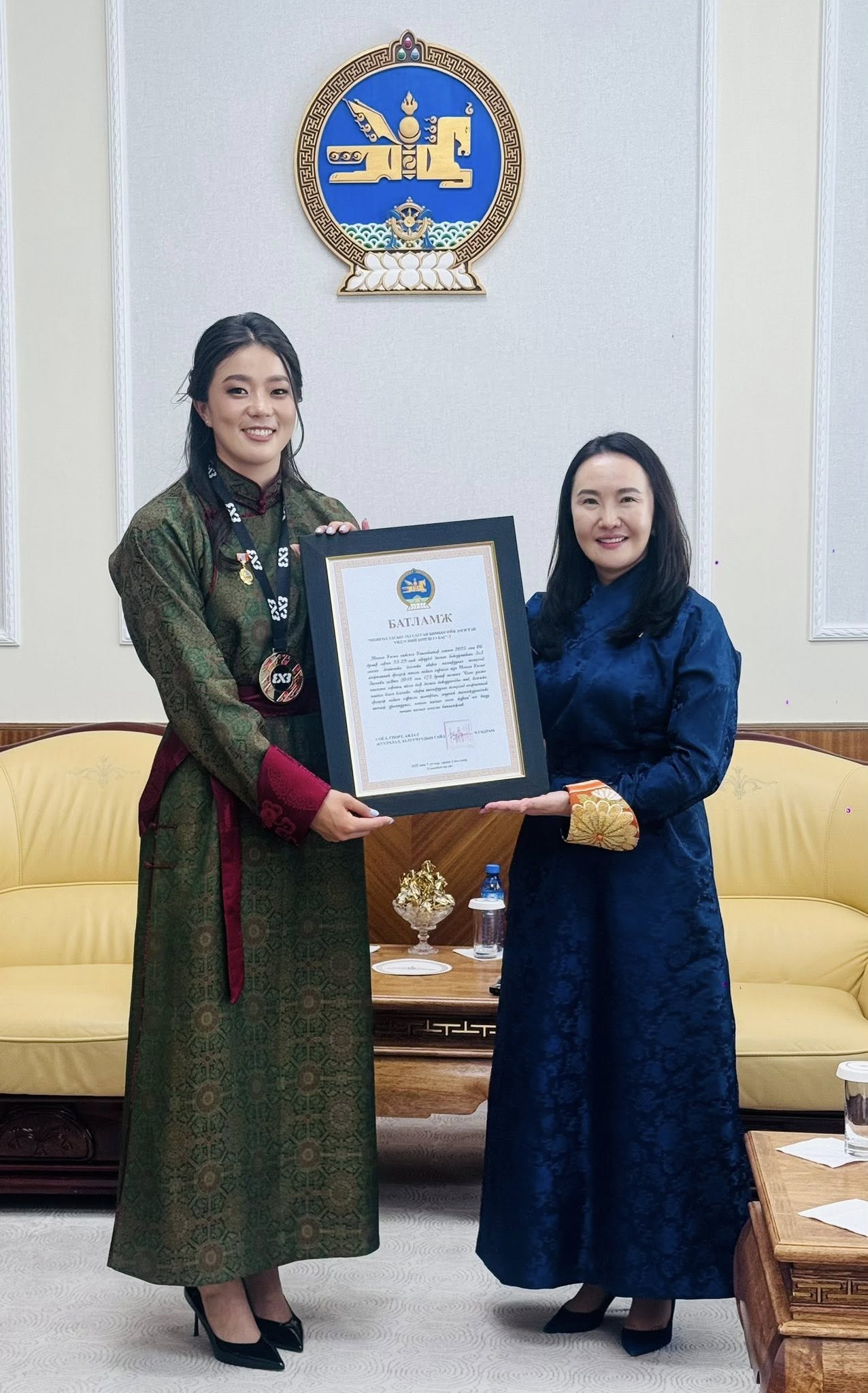 Энэхүү түүхэн амжилтыг төр засгаас өндрөөр үнэлж 2025 оны 7 дугаар сарын 02-ны өдөр Төрийн ордноо Монгол Улсын Ерөнхийлөгч Ухнаагийн Хүрэлсүх шигшээ багийн тамирчид, дасгалжуулагчийг хүлээн авч, Гавьяат тамирчин цол, медаль хүртээлээ.