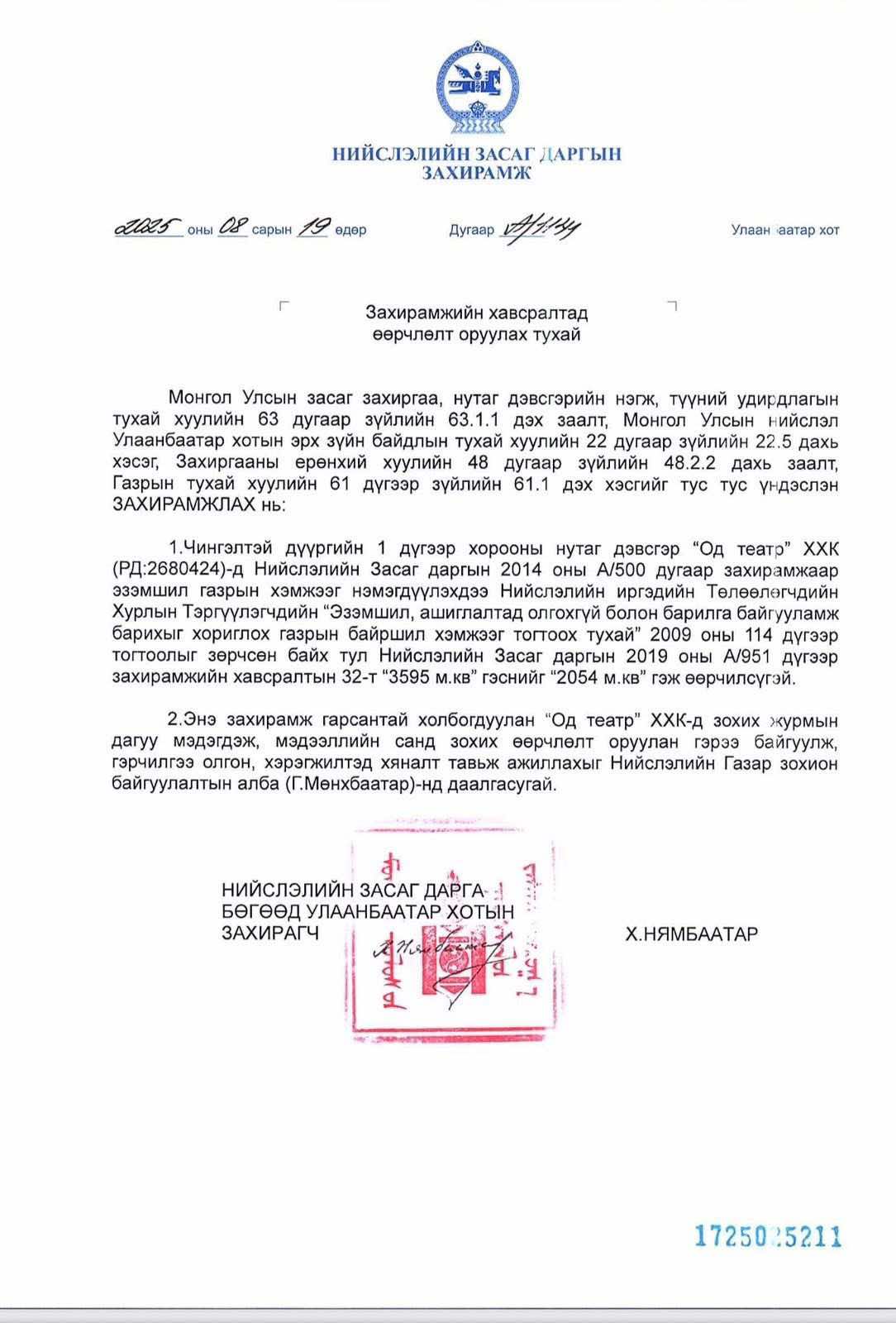 Ингэснээр “Ард” кино театрын урд талын ногоон байгууламж бүхий талбай нийтийн эзэмшилд шилжинэ. Уг өөрчлөлтийг нийслэлийн Засаг дарга бөгөөд Улаанбаатар хотын Захирагч Х.Нямбаатарын наймдугаар сарын 19-ний өдрийн захирамжаар шийдэв. Уг захирамж гарсантай холбогдуулан “Од театр” ХХК-д зохих журмын дагуу мэдэгдэж, мэдээллийн санд зохих өөрчлөлт оруулан гэрээ байгуулж, гэрчилгээ олгон, хэрэгжилтэд хяналт тавьж ажиллахыг нийслэлийн Газар зохион байгуулалтын албанд үүрэг болголоо.