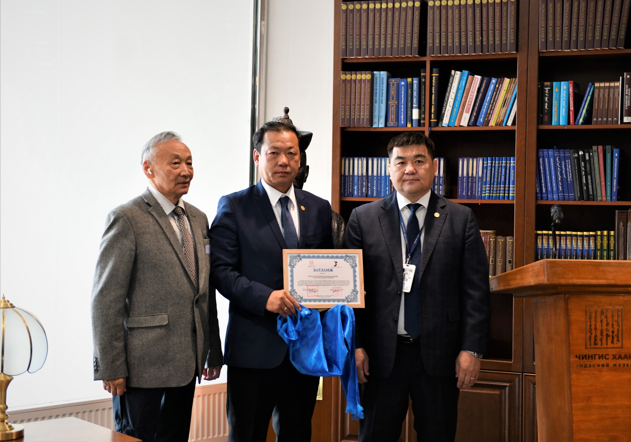 Мөн Чингис хаан Үндэсний музейн номын сангийн баяжилтад үнэтэй хувь нэмэр оруулж, ном бүтээлээ хандивласанд талархал илэрхийлж Чингис хаан Үндэсний музейн “Батламж”-ийг “Бодлогот Баатар Цэнд Гүн” ТББ-ын тэргүүн Д.Начин, доктор профессор Г.Мягмарсамбуу нарт дурсгал болгон хадгалууллаа.