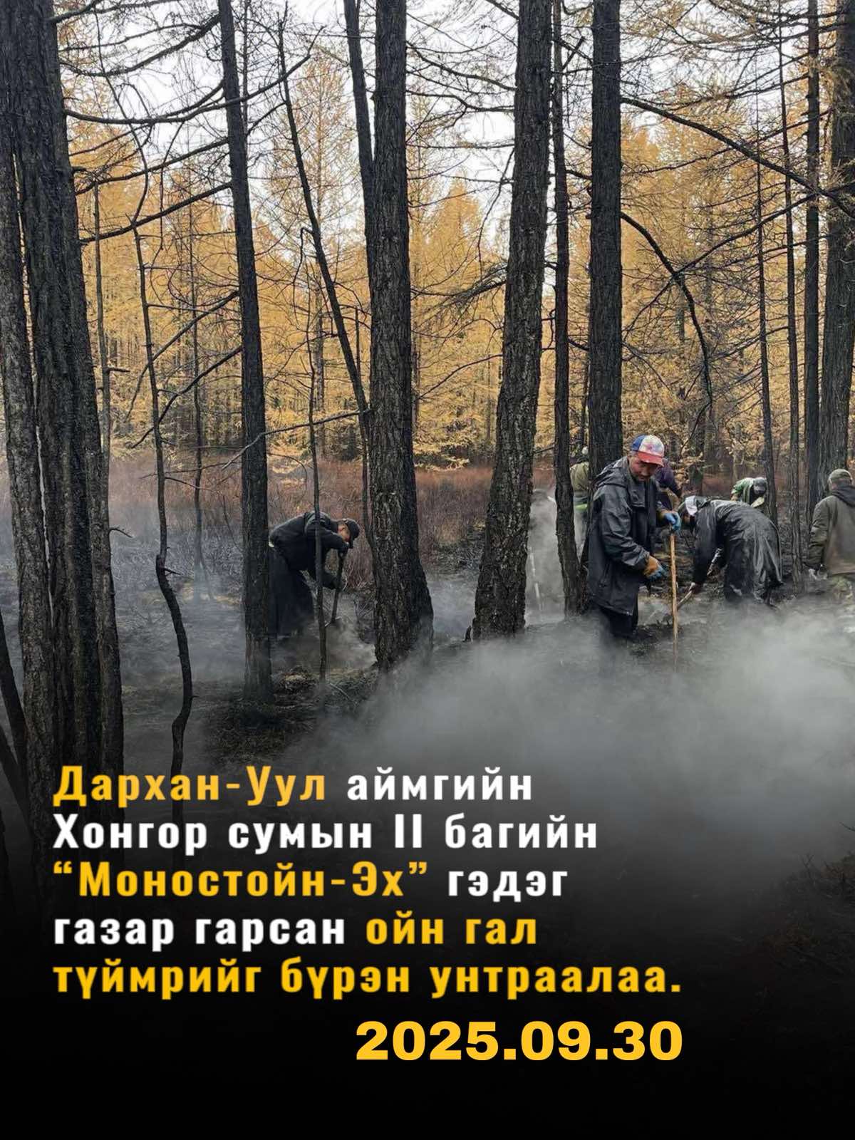 Дархан-Уул аймгийн Хонгор сумын II багийн “Моностойн-Эх” гэдэг газар энэ сарын 28-нд гарсан ойн түймрийг 29-ний өдрийн 17:00 цагт цурамд оруулж, өнөөдөр /2025.09.30/ 12:12 цагт бүрэн унтраалаа.