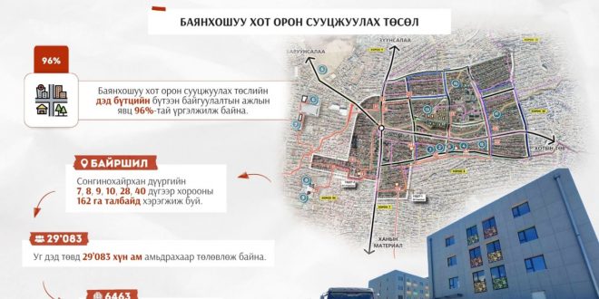 Улаанбаатар хотын хөгжлийн 24 мега төслийн нэг Баянхошуу хот орон сууцжуулах төсөл буюу Баянхошуу дэд төвийн хүрээнд Сонгинохайрхан дүүргийн 7, 8, 9, 10, 28, 40 дүгээр хорооны 162 га талбайд хэрэгжиж буй. Уг дэд төвд 30 мянга орчим хүн ам амьдрахаар төлөвлөж байгаа бөгөөд нийт 6463 айлын орон сууц барих юм.