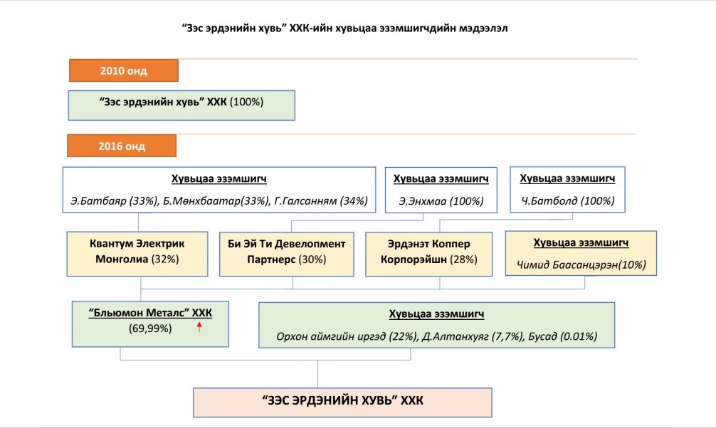 Анх тус овоолгыг “Зэс эрдэнийн хувь” ХХК-д өгөхөд Эрдэнэтийн 24500 иргэн тус компанийн 74 %-ийг эзэмшдэг байсан бол өдгөө 24500 иргэн 22 хувь болж буусан аж. Харин эрх мэдэлтнүүд 70 %-ийн хувьцааг нь эзэмшихийн зэрэгцээ тус компаниас олох ашгийг 70 хувийг хүртсээр байна.