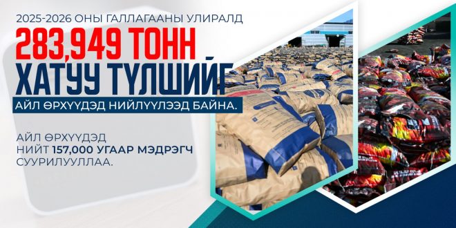 Улаанбаатар хотод гэр хорооллын 171.9 мянган өрх, 804.6 мянган автомашин байна. Гэр хорооллын өрхийн утаа агаарын бохирдлын 55.6 хувь, автомашины утаа 28.9 хувь, ДЦС-ын үнсэн сан зэрэг бусад эх үүсвэр 15.5 хувийг эзэлдэг. 2025-2026 оны галлагааны улиралд агаарын бохирдлыг бууруулах зорилгоор хагас коксон шахмал түлшийг айл өрхүүдэд нийлүүлж байгаа. Энэ галлагааны улиралд 425 борлуулалтын цэгээр хагас кокс, мидлинг, сайжруулсан түлш нийлсэн нийт 283,949 тонн хатуу түлшийг нийлүүллээ. Үүнээс энэ жил 210,328 тонн хагас коксон түлшийг хэрэглээд байна. Агаарын бохирдлыг бууруулах, угаарын хийн хордлогоос урьдчилан сэргийлэх, иргэдийн аюулгүй байдлыг хангахын тулд айл өрхүүдийн эвдрэл гэмтэлтэй зуухыг сольж, стандартад нийцсэн, давхар шаталтат 32 мянган зуухыг нийслэлийн долоон дүүргийн гэр хорооллын айл өрхөд суурилуулж байна.
