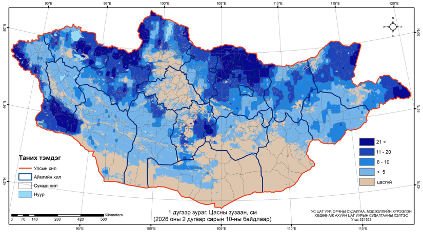 Ус цаг уур, орчны судалгаа мэдээллийн хүрээлэнгийн цасны зузаан, нягт, агаарын температурын олон жилийн дундажтай харьцуулсан мэдээллээр зудын байдлыг үнэлэхэд 11 аймгийн 56 сумын нутаг цагаан зудтай, 15 аймгийн 56 сумын нутаг зудархуу байна.