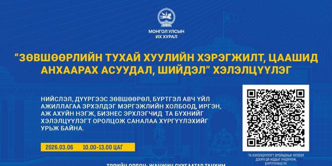 Хэлэлцүүлэгт оролцох хүсэлтэй мэргэжлийн холбоод, иргэн, аж ахуй нэгж, бизнес эрхлэгчид, олон нийтийн байгууллагын төлөөлөл энэхүү холбоосоор, эсвэл QR кодоор цахимаар 2026 оны 3 дугаар сарын 06-ны өдрийн 09.00 цагаас өмнө бүртгүүлнэ үү.