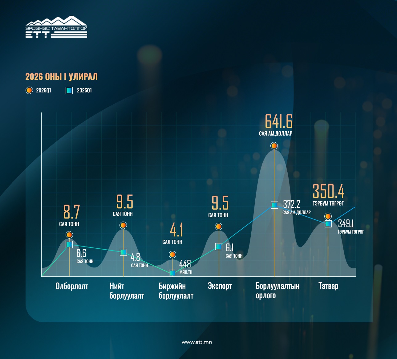 Өнгөрсөн 2025 оны нэгдүгээр улиралд 4.8 сая тонн нүүрс борлуулж байсан бол энэ оны 1 дүгээр улиралд 9.5 сая тонн нүүрс борлуулж 101% өсөлттэй гарлаа. Экспорт өнгөрсөн оны 1 дүгээр улиралд 6.1 сая тонн байсан бол энэ оны 1 дүгээр улиралд 9.5 сая тоннд хүрч 56% өслөө.