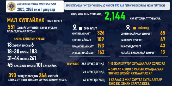 Прокурорын байгууллагаас 2025 он, 2026 оны I улирлын байдлаар Эрүүгийн хуулийн 17.12 дугаар зүйлд заасан “Мал хулгайлах” нийт 2,144 хэрэгт хяналт тавьжээ.