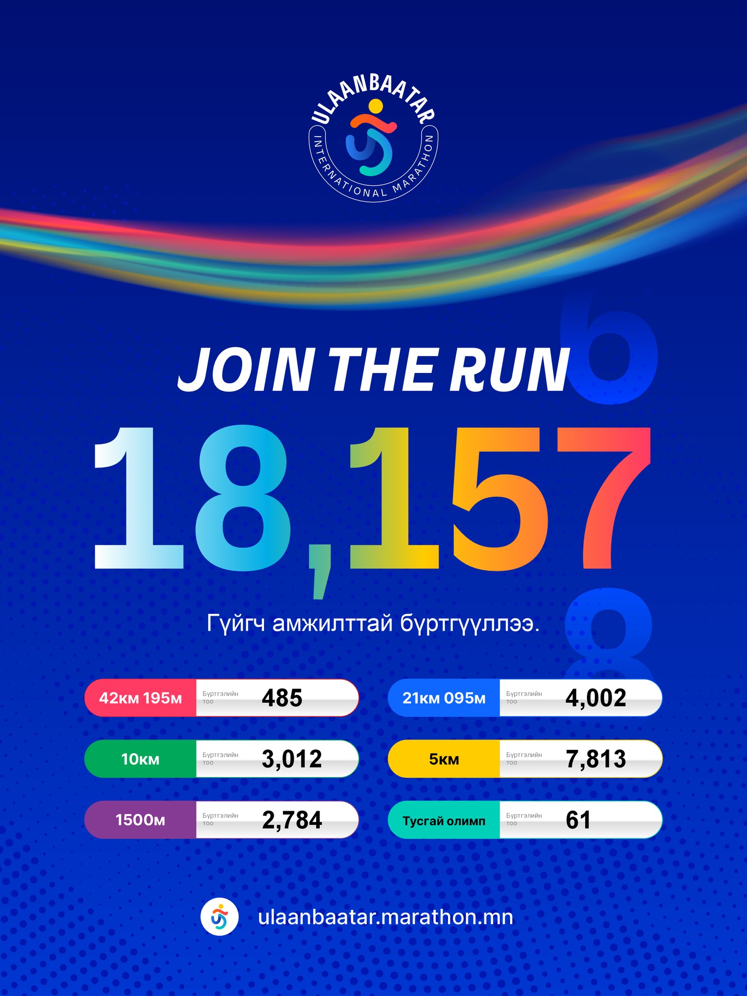 “Улаанбаатар марафон-2026” олон улсын гүйлтийн бүртгэл хаахад гурав хоног үлдлээ. Марафонд гүйх оролцогчдыг тавдугаар сарын 1-ний 17:00 цаг хүртэл бүртгэнэ. Оролцогчид Hipay аппликейшн болон ulaanbaatar.marathon.mn цахим хуудсаар дамжуулан бүртгүүлэх боломжтой. Өдгөө 11 дэх удаа зохион байгуулах гэж буй “Улаанбаатар марафон-2026” олон улсын гүйлтэд оролцохоор дөрөвдүгээр сарын 28-ны өдрийн байдлаар 18 мянга гаруй хүн бүртгүүлээд байна.