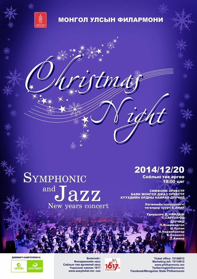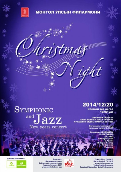 Хүн төрөлхтний түүхэн дэх хамгийн эртний баяр болох шинэ жилийн баярыг улс орон даяараа угтах гэж буй энэ цаг мөчид монгол улсын Филармони шинэ жилийн хөгжмийн “Christmas night” тоглолтоо 12-р сарын 20-нд 18.00 цагт Соёлын төв өргөөнд үзэгчдийн хүртээл болгох гэж байна.