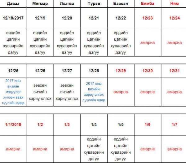 Консулын хэлтсийн ажиллах цагийн хуваарь /2017 оны сүүл болон 2018 оны эхээр/