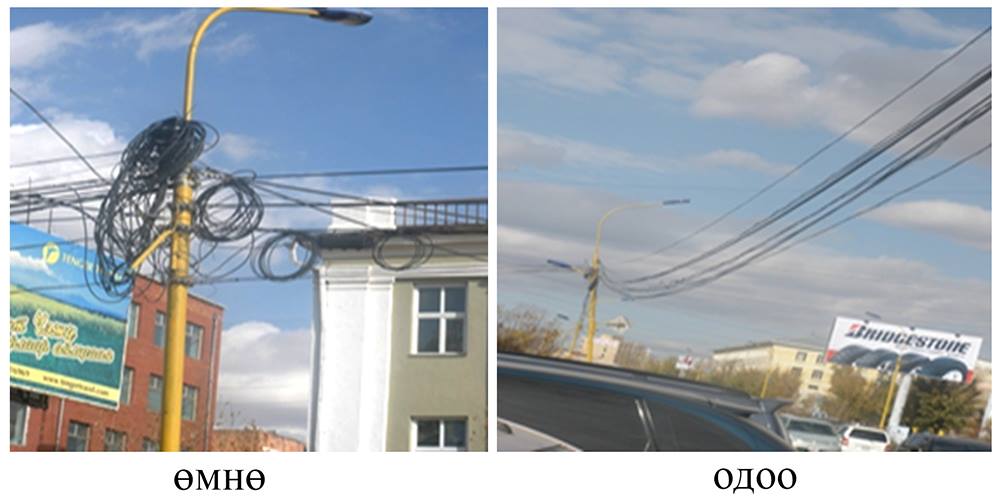 Нийслэлийн Засаг дарга бөгөөд Улаанбаатар хотын Захирагч С.Амарсайханаас өгсөн үүрэг чиглэлийн дагуу Улаанбаатар хотын Захирагчийн ажлын албанаас гэрэлтүүлгийн шон дээгүүр татсан шилэн кабелийг цэгцлэх 14 хоногийн аяныг энэ сарын 1-нээс эхэлсэн. Нийслэлийн Мэдээлэл, технологийн газар болон шилэн кабелийн үйлчилгээ эрхлэгч байгууллагуудтай хамтран ажиллаж байгаа бөгөөд өнөөдрийн байдлаар хотын төвийн 49 гудамжаар татагдаад байсан 60718м кабелийг цэгцэлжээ. Шилэн кабель цэгцлэх ажлыг энэ сарыг дуустал үргэлжлэх юм. Хотын захиарагчаас өгсөн үүрэг даалгаварын фото зургаар харуулья.