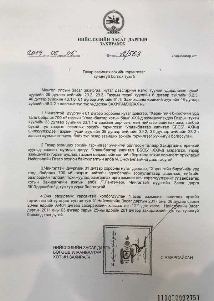 Нийслэлийн Засаг дарга бөгөөд Улаанбаатар хотын Захирагч С.Амарсайхан Чингэлтэй дүүргийн нэгдүгээр хорооны нутаг дэвсгэр, “Хөрөнгийн бирж”-ийн урд талд байрлах 700 мкв газрыг эзэмшиж буй “Улаанбаатар капитал ББСБ” компанийн эзэмших эрхийг цуцлах захирамж гаргалаа.