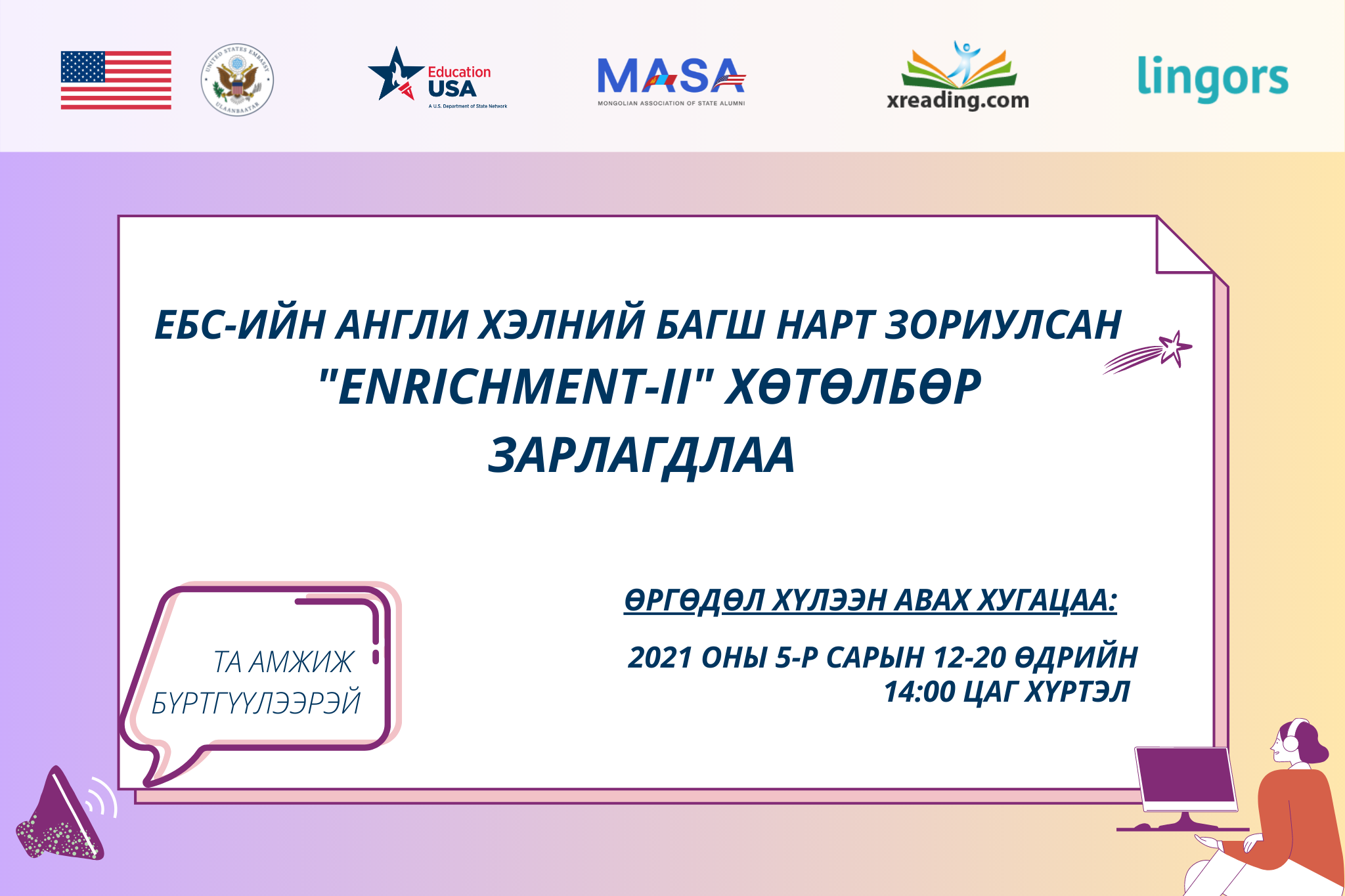 АНУ-ын Элчин сайдын яам, Монгол дахь Америкт Төгсөгчдийн Холбоо (MASA), EducationUSA Mongolia хөтөлбөр, Лингорс, Xreading цахим номын сангийн Монгол дахь төлөөлөгч байгууллага хамтран улсын болон хувийн бүх Ерөнхий боловсролын сургуулийн Англи хэлний багш нарт зориулан “ENRICHMENT-2021” хөтөлбөрийг зарлаж байна. 2020 онд зохион байгуулагдсан “Enrichment-I” хөтөлбөрт 500 Англи хэлний багш шалгаран оролцож ТОП-20 багш шалгарч байсан бол 2021 онд “Enrichment-II” хөтөлбөрт …